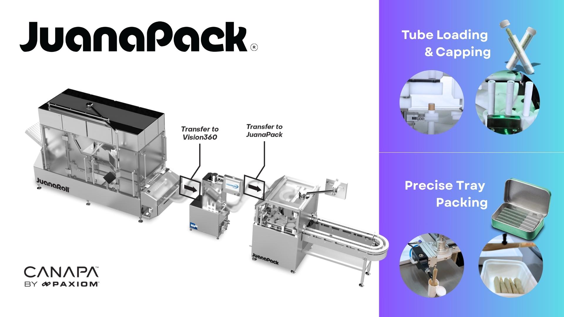 April 17, 2025 – Las Vegas, NV – Canapa by Paxiom, a global leader in automated cannabis packaging solutions, is proud to introduce JuanaPack™, its most advanced and versatile pre-roll end-of-line automation system to date. JuanaPack is designed to revolutionize both tube loading and tray packing of pre-rolls—delivering unmatched speed, precision, and customization in a single, unified platform.