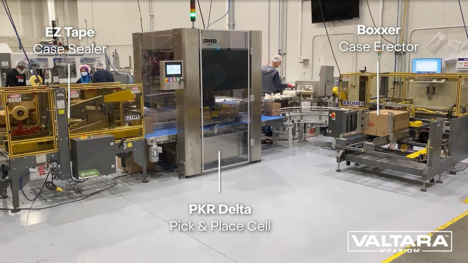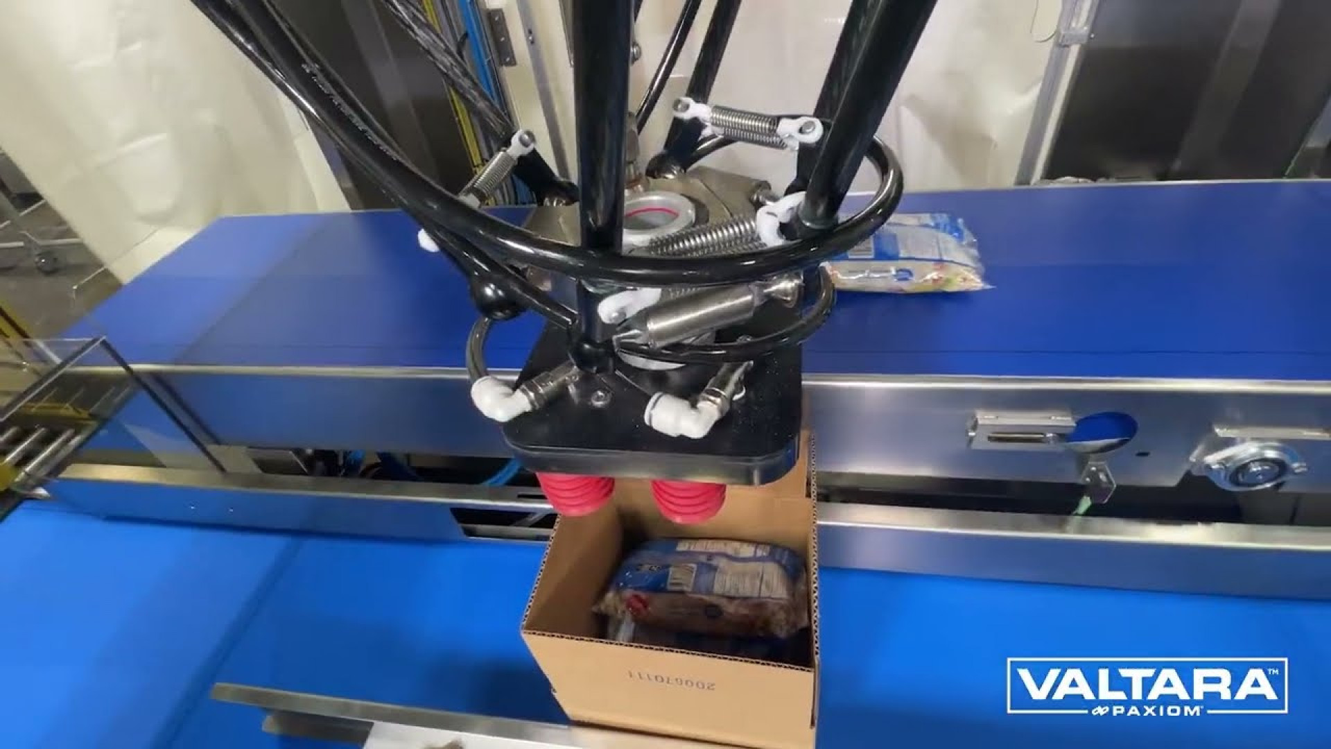 Our PKR modular pick & place cell will automatically top-load your flexible bags and packages into cases or trays using our Delta Robot.